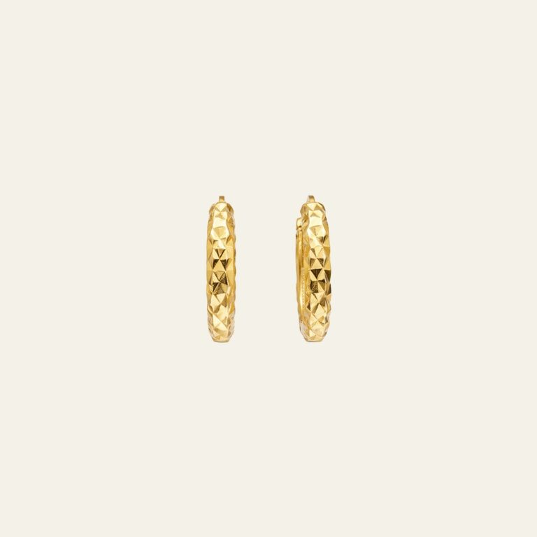 Marka: Roven | Ürün Tipi: Halka küpe | Malzeme: 14 Ayar saf altın | Ağırlık: 1.38 gram | Renk: Sarı altın | Tasarım: Elmas kesim (fasetli) halka form | Yüzey: Parlak ve ışık yansıtıcı kesim | Kilit Tipi: Mandallı kilit | Taş Detayı: Yok | Kullanım: Günlük ve özel kullanım | Stil: Minimal, zarif ve ışıltılı