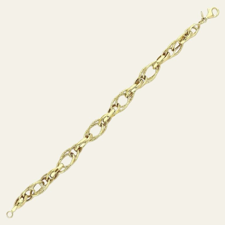 Zarif ve modern tasarımıyla öne çıkan bu bileklik, klasik zincir stilini büyük oval halka detaylarıyla bir araya getirerek bileğinizde güçlü ve estetik bir görünüm oluşturur. Birbirine akıcı şekilde bağlanan oval formdaki halkalar tasarıma hareket ve karakter kazandırırken, parlak yüzeyli altın formu ışığı farklı açılardan yansıtarak bileğinizde canlı ve zarif bir ışıltı oluşturur. Altının sıcak sarı tonu ile birleşen bu modern zincir yapısı sade kombinlere güçlü bir stil dokunuşu katarken, daha özenli kombinlerde de dikkat çekici ama dengeli bir tamamlayıcı haline gelir. Akıcı ve dengeli yapısı bileğe rahatça uyum sağlar ve gün boyu konforlu bir kullanım sunar. 7.46 gramlık dengeli yapısı sayesinde hem estetik hem de güçlü bir duruş sunan bu tasarım, modern çizgilerle zamansız altın zarafetini bir araya getirir. Bu bileklik yalnızca bir aksesuar değil; zarafeti, güçlü stil anlayışını ve modern altın tasarımını bileğinizde taşıyan özel bir mücevher parçasıdır.