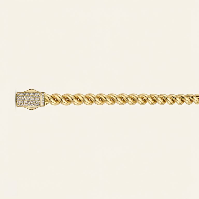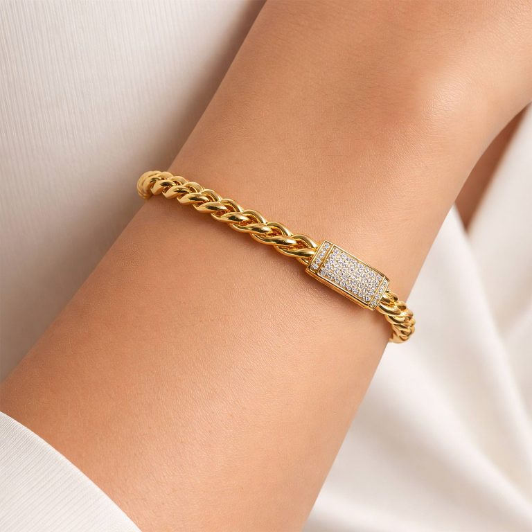 Güçlü ve iddialı tasarımıyla öne çıkan bu bileklik, klasik gurmet zincir formunu taşlı kilit detayıyla bir araya getirerek bileğinizde dikkat çekici ve lüks bir görünüm oluşturur. Kalın ve dolgun zincir yapısı bilekte sağlam ve etkileyici bir duruş sağlarken, uç kısmında yer alan ışıltılı kilit detayı tasarıma modern ve göz alıcı bir karakter kazandırır. Parlak yüzeyli altın form ışığı farklı açılardan yansıtarak bileğinizde yoğun ve canlı bir ışıltı oluşturur. Taşlı kilit detayı ise bu ışıltıyı tamamlayarak tasarımı daha da ön plana çıkarır. Altının sıcak sarı tonu ile birleşen bu güçlü model, sade kombinlere iddialı bir şıklık katarken özel günlerde de stilinizi tamamlayan dikkat çekici bir parça haline gelir. Dengeli ve sağlam yapısı sayesinde bileğe güvenli şekilde oturur ve gün boyu konforlu bir kullanım sunar. 16.10 gramlık yüksek ağırlığı ile bilekte dolgun, güçlü ve prestijli bir duruş sağlayan bu tasarım, altının değerini en etkileyici haliyle yansıtır. Bu bileklik yalnızca bir aksesuar değil; gücü, zarafeti ve modern lüks anlayışını bir araya getiren özel bir mücevher parçasıdır.