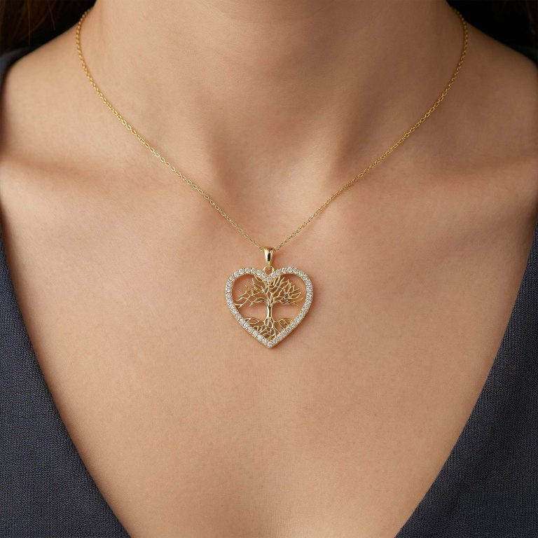 Hayatın köklerini, büyümeyi ve bağlılığı simgeleyen bu özel tasarım kolye; kalp formu ve hayat ağacı figürünü zarif bir uyumla bir araya getirir. Kalbin içinde yer alan hayat ağacı detayı, güçlü kökleri ve uzanan dallarıyla yaşamın sürekliliğini ve sevdiklerinle kurduğun bağı temsil eder. Etrafını çevreleyen taş süslemeler ise kolyeye yumuşak ama dikkat çekici bir ışıltı kazandırır. Gün ışığında altının sıcak tonu doğal bir parıltı sunarken, akşam ışıklarında taş detayları daha belirgin bir ışıltı oluşturur. 2.25 gramlık hafif yapısı sayesinde boyunda konforlu bir kullanım sağlar ve gün boyu zarif bir şekilde varlığını hissettirir. Bu kolye yalnızca şık bir takı değil; sevgi, yaşam ve bağlılık sembolünü taşıyan anlamlı bir tasarım parçasıdır.