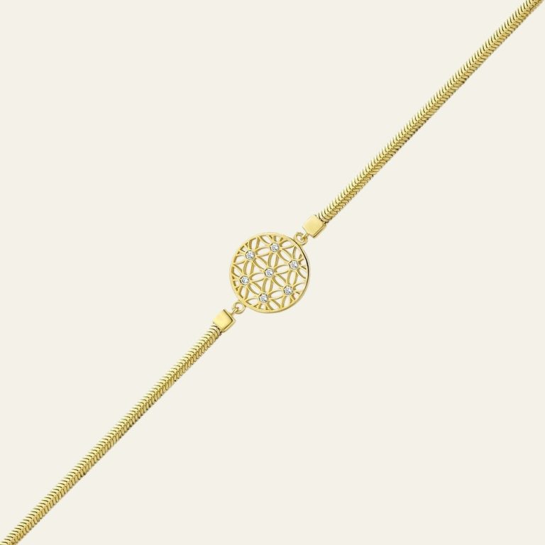 Zarif ve estetik tasarımıyla öne çıkan bu bileklik, minimal zincir formunu özel motif detayıyla bir araya getirerek bileğinizde modern ve dikkat çekici bir görünüm oluşturur. İnce ve akıcı zincir yapısı bilekte zarif bir duruş sağlarken, merkezde yer alan yuvarlak motif detayı tasarıma karakter ve sanatsal bir dokunuş kazandırır. Özenle işlenmiş geometrik desenler ışığı farklı açılardan yansıtarak bileğinizde canlı ve zarif bir ışıltı oluşturur. Altının sıcak sarı tonu ile birleşen bu detay, sade kombinlere şık bir dokunuş katarken daha özenli stillerde de dikkat çekici ama dengeli bir tamamlayıcı haline gelir. Akıcı zincir yapısı bileğe rahatça uyum sağlar ve gün boyu konforlu bir kullanım sunar. 3.87 gramlık dengeli yapısı sayesinde hem hafif hem de estetik bir duruş sağlayan bu tasarım, minimal çizgilerle zarif motif sanatını bir araya getirir. Bu bileklik yalnızca bir aksesuar değil; zarafeti, ince işçiliği ve modern altın stilini bileğinizde taşıyan özel bir mücevher parçasıdır. -