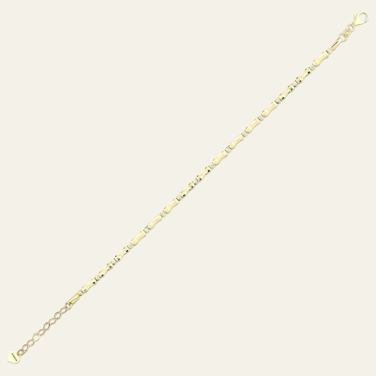 Zarif ve modern tasarımıyla öne çıkan bu bileklik, minimal zincir formunu estetik halka detaylarıyla bir araya getirerek bileğinizde şık ve dengeli bir görünüm oluşturur. İnce ve akıcı zincir yapısı bilekte narin bir duruş sağlarken, tasarım boyunca yer alan özel formdaki halka detayları bilekliğe modern ve karakterli bir stil kazandırır. Parlak yüzeyli altın form ışığı farklı açılardan yansıtarak bileğinizde canlı ve zarif bir ışıltı oluşturur. Altının sıcak sarı tonu ile birleşen bu sade tasarım, günlük kombinlere modern ve şık bir dokunuş katarken daha özenli stillerde de zarif bir tamamlayıcı haline gelir. Akıcı yapısı sayesinde bileğe rahatça uyum sağlar ve gün boyu konforlu bir kullanım sunar. 2.77 gramlık hafif ve dengeli yapısı sayesinde bilekte zarif ve estetik bir duruş sağlayan bu tasarım, minimal çizgilerle modern altın zarafetini bir araya getirir. Bu bileklik yalnızca bir aksesuar değil; zarafeti, sadeliği ve modern stil anlayışını bileğinizde taşıyan özel bir mücevher parçasıdır