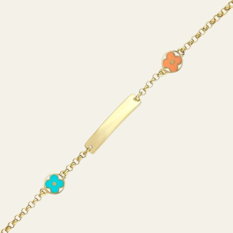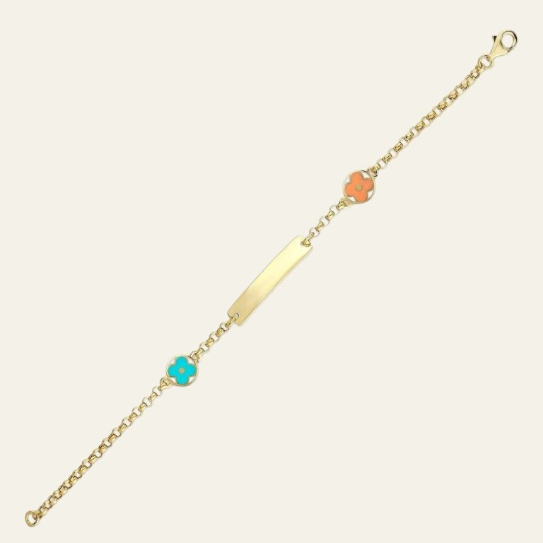 14 ayar saf altın – Değerini koruyan dayanıklı yapı | İsim plakalı tasarım – Kişisel ve anlamlı stil | Çiçek figür detay – Canlı ve enerjik görünüm | Turkuaz ve turuncu mine dokunuş – Renkli ve dikkat çekici stil | Sarı altın renk – Zamansız ve sıcak ton | 2.90 gram ağırlık – Hafif ve konforlu kullanım | İnce zincir form – Günlük kullanım için ideal tasarım | Minimal stil – Zarif ve modern görünüm sağlar