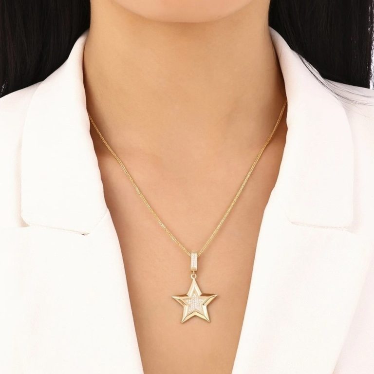 Yıldız formunun zarif ve anlamlı sembolizmini taşıyan bu kolye, stiline ışık ve enerji katan özel bir tasarımdır. Keskin ama dengeli yıldız formu, merkezde yer alan taş süslemelerle birleşerek güçlü bir ışıltı oluşturur. Gün ışığında altının sıcak tonu sade bir parıltı sunarken, akşam ışıklarında taş detayları daha belirgin bir şekilde ışığı yansıtır. Minimal ama dikkat çekici yapısı sayesinde hem günlük kombinlerde zarif bir dokunuş sağlar hem de özel anlarda stilinin odak noktası haline gelir. 2.84 gramlık dengeli yapısı boyunda konforlu bir kullanım sunar ve gün boyu varlığını zarif bir şekilde hissettirir. Bu kolye yalnızca bir aksesuar değil; umut, ışık ve ilhamı temsil eden anlamlı bir tasarım parçasıdır.