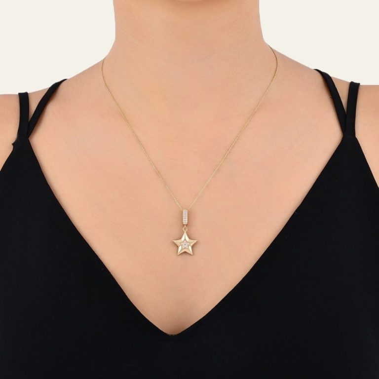 Gökyüzünün en zarif sembollerinden biri olan yıldız formu, bu kolyede sade ama etkileyici bir tasarımla hayat buluyor. Yıldızın merkezinde yer alan taş süslemeler, ışığı yakalayarak kolyeye zarif bir parıltı kazandırır. Altının sıcak tonu ile birleşen bu ışıltı, gün ışığında doğal ve yumuşak bir parlaklık oluştururken akşam ışıklarında daha belirgin ve dikkat çekici bir görünüm sunar. Minimal formu sayesinde günlük kombinlere kolayca uyum sağlar ve zarif bir stil tamamlayıcısı olur. 1.41 gramlık hafif yapısı sayesinde boyunda konforlu bir kullanım sunar ve gün boyu varlığını rahatsız etmeden hissettirir. Bu kolye yalnızca bir aksesuar değil; umut, ışık ve ilhamı temsil eden zarif bir tasarım parçasıdır.